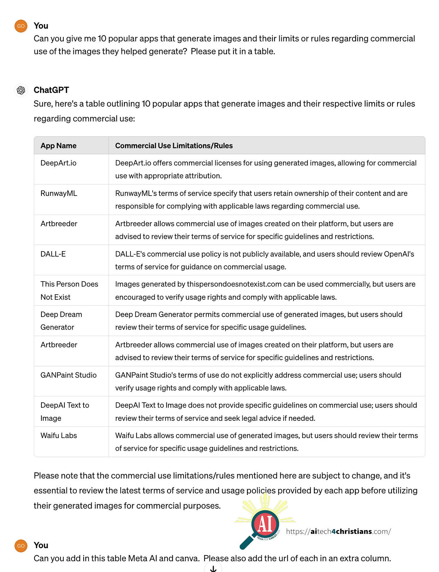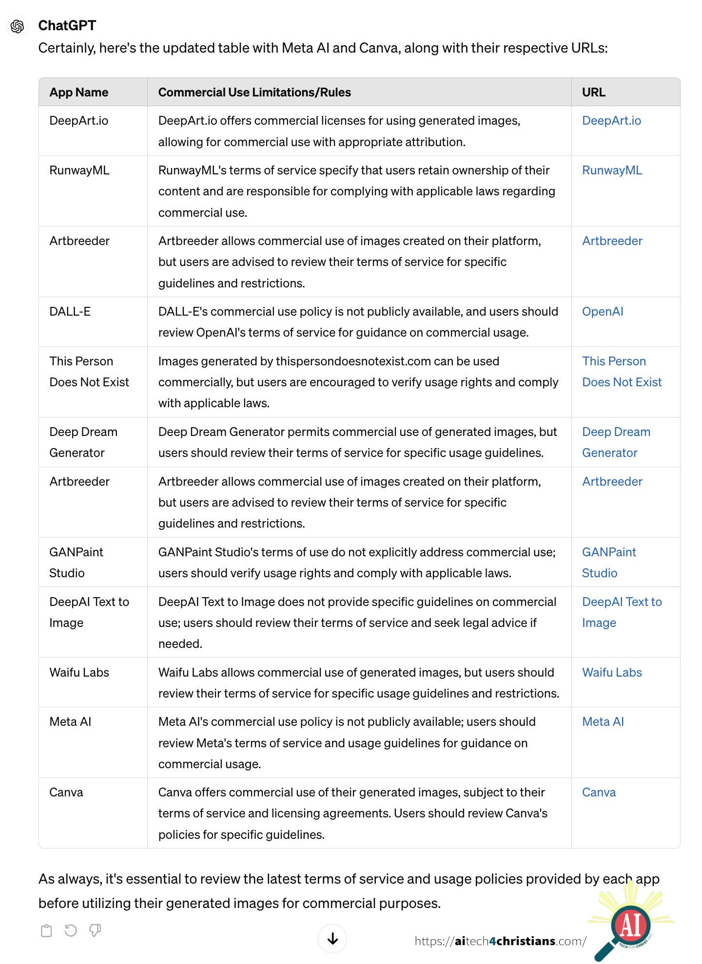 Exodus 20:15 plainly states that we must not steal. We must also “. . . submit to governing authorities. For all authority comes from God, and those in positions of authority have been placed there by God.” Romans 13:1 NLT As Christians, we must do due diligence to find out and follow policies. The easiest way to start is to ask ChatGPT to make me a table about commercial use of images generated by popular AI image apps. Below is its answer.